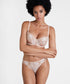 The underwired half-cup bra from the Mélodie d'Été line is available up to cup size G. The push-up cleavage is shaped by luxurious cups trimmed with floral lace. The pinkish tones of the embroidery are enhanced by touches of gold-coloured lurex that echo the pretty buttons between the cups. The shoulders are embellished with gorgeous braided straps.